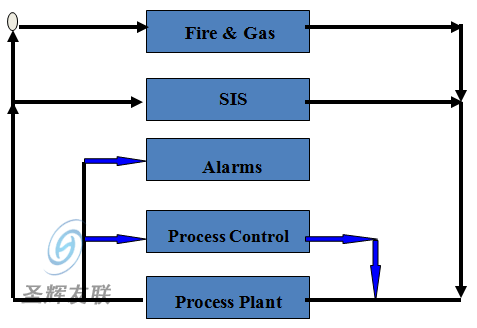 DCS作為基本過程控制系統(tǒng),主要對(duì)生產(chǎn)指標(biāo)進(jìn)行實(shí)時(shí)連續(xù)的監(jiān)控和調(diào)節(jié),同時(shí)也對(duì)工藝風(fēng)險(xiǎn)起道了第一道防護(hù)和報(bào)警提示的作用;SIS系統(tǒng)對(duì)工藝風(fēng)險(xiǎn)起到了第二道防護(hù)作用,其結(jié)果是安全聯(lián)鎖停車,使工藝裝置回到安全狀態(tài),避免事故的發(fā)生;FGS的作用降低事故發(fā)生后的危害程度。